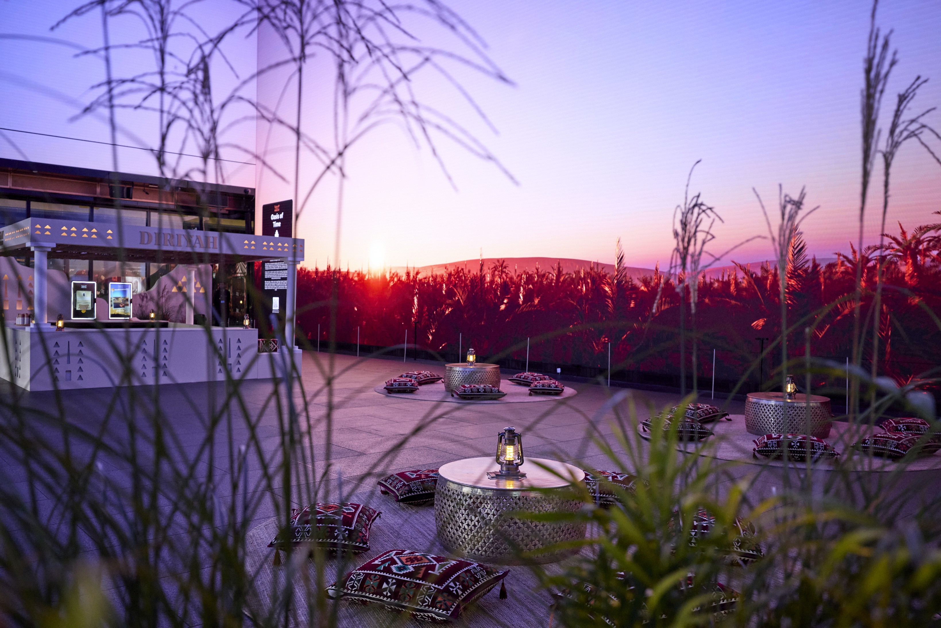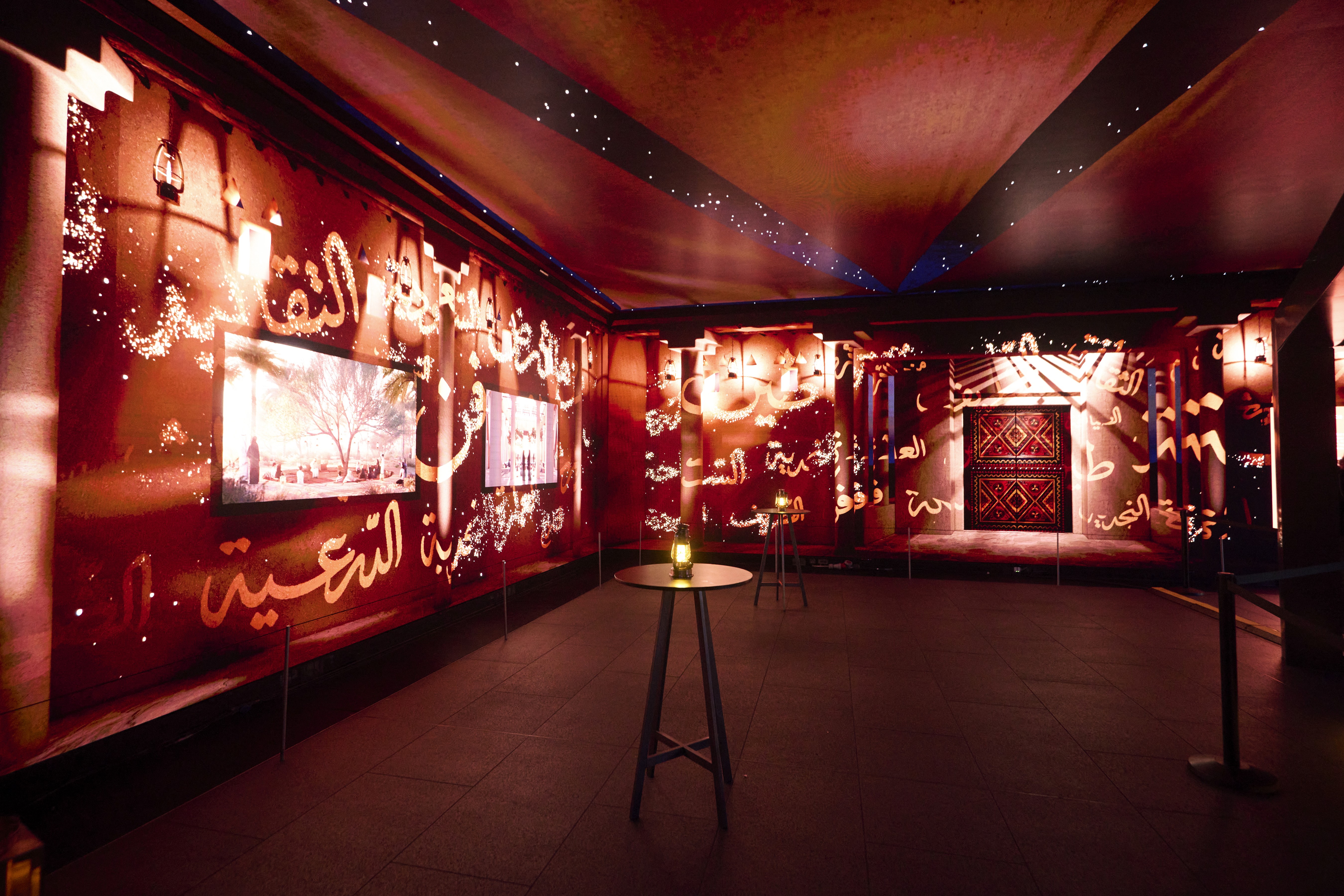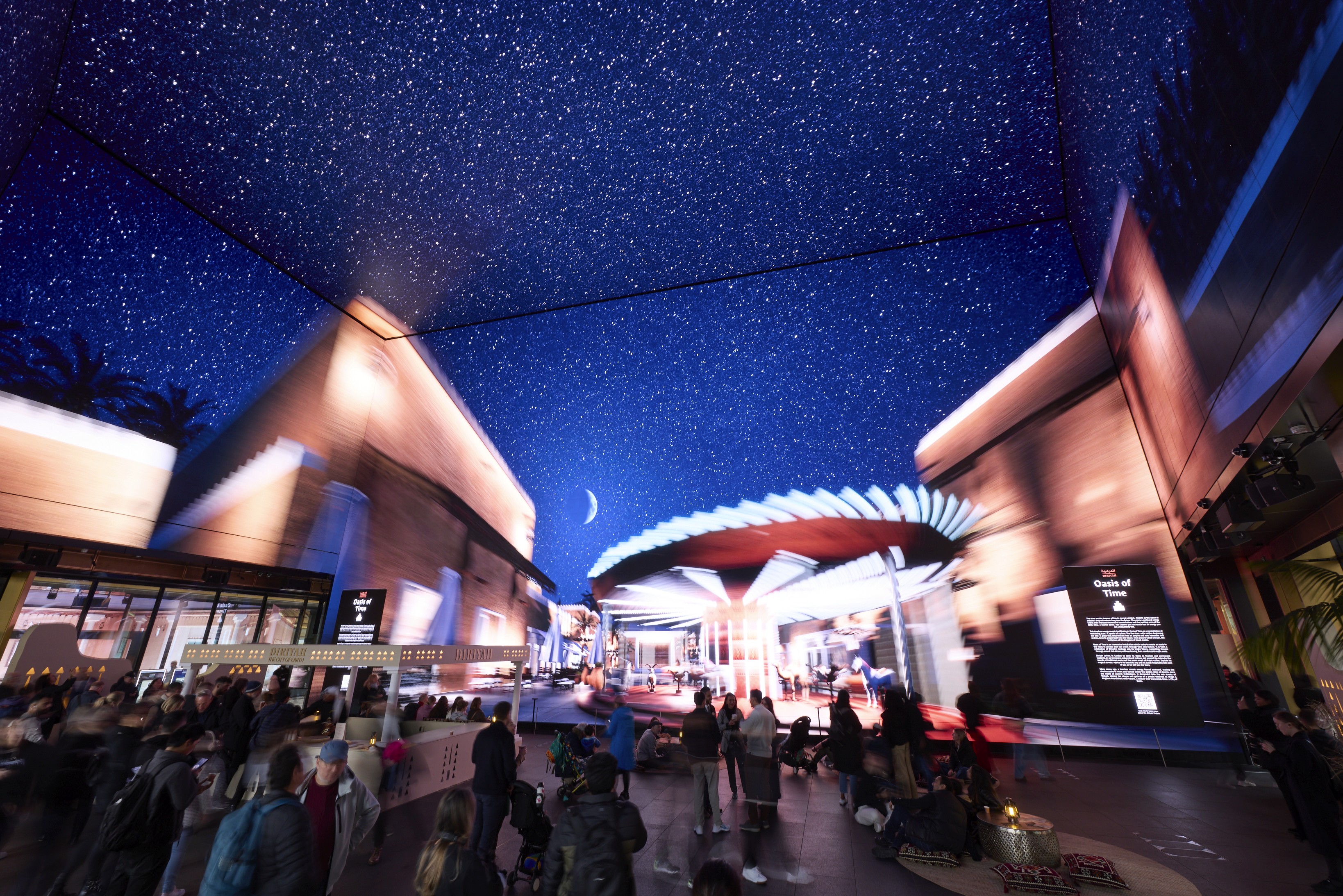 Now Arcade: A transitional sensory tunnel that used high-resolution Media to maintain the atmospheric golden hour of Diriyah as people moved through the venue.