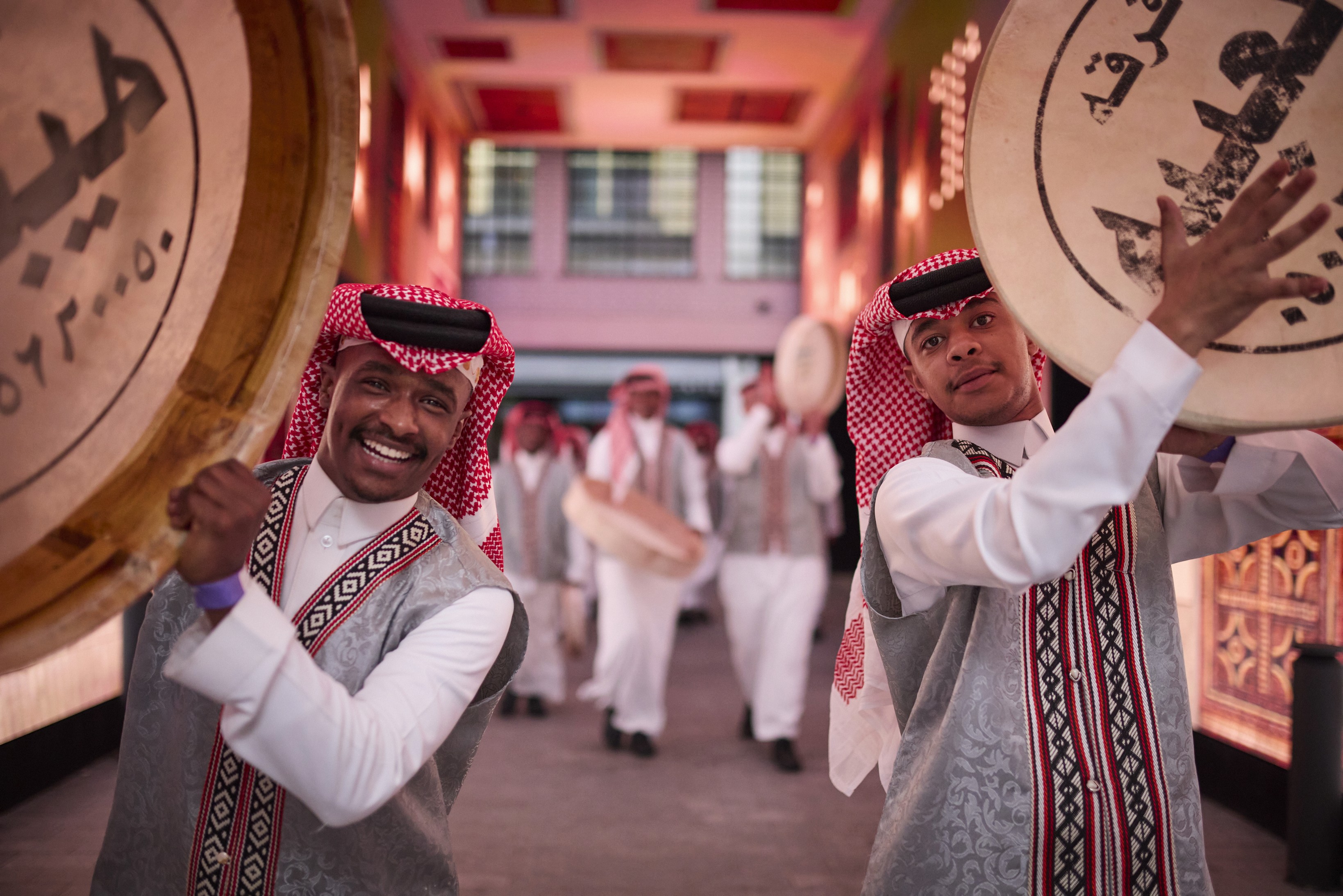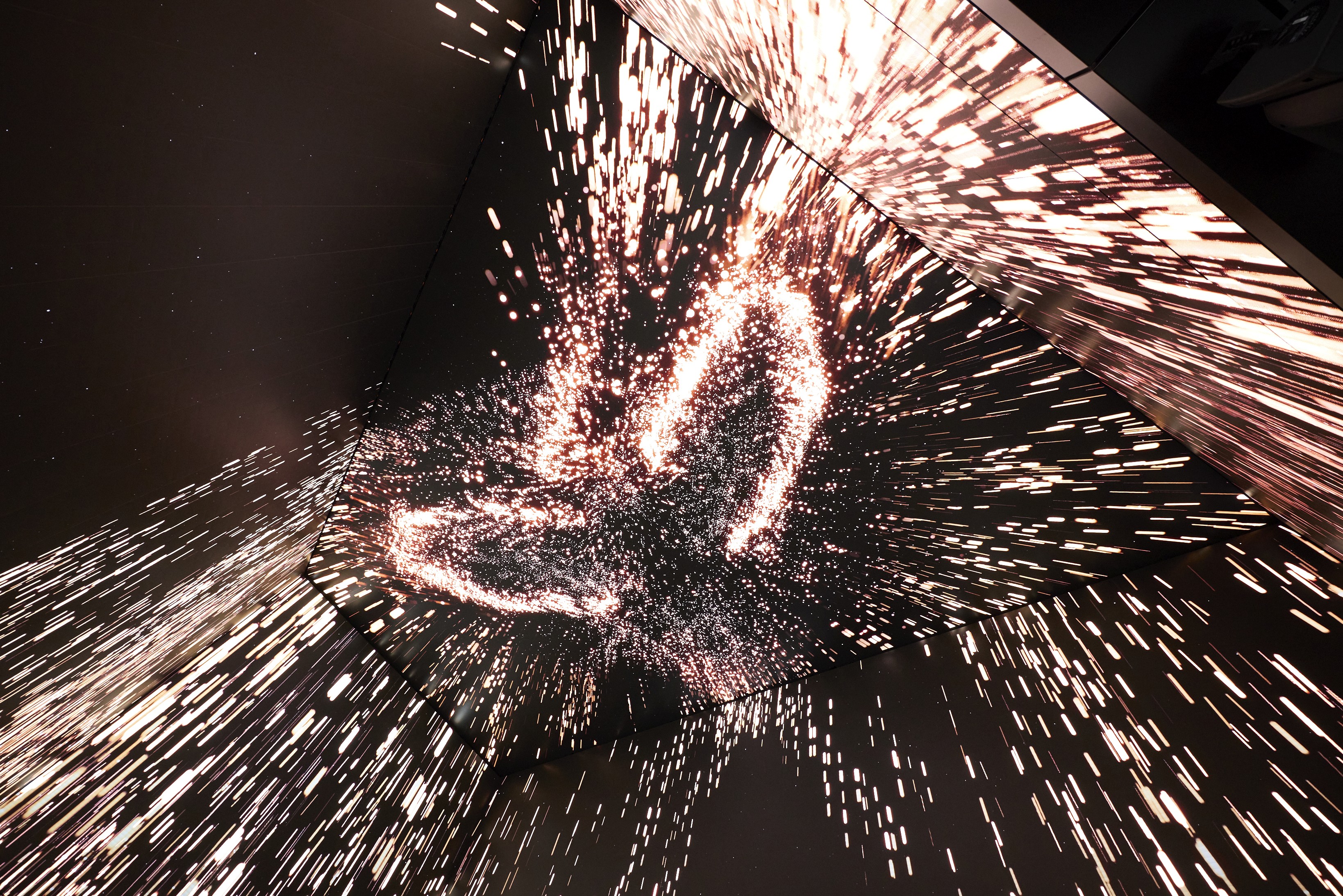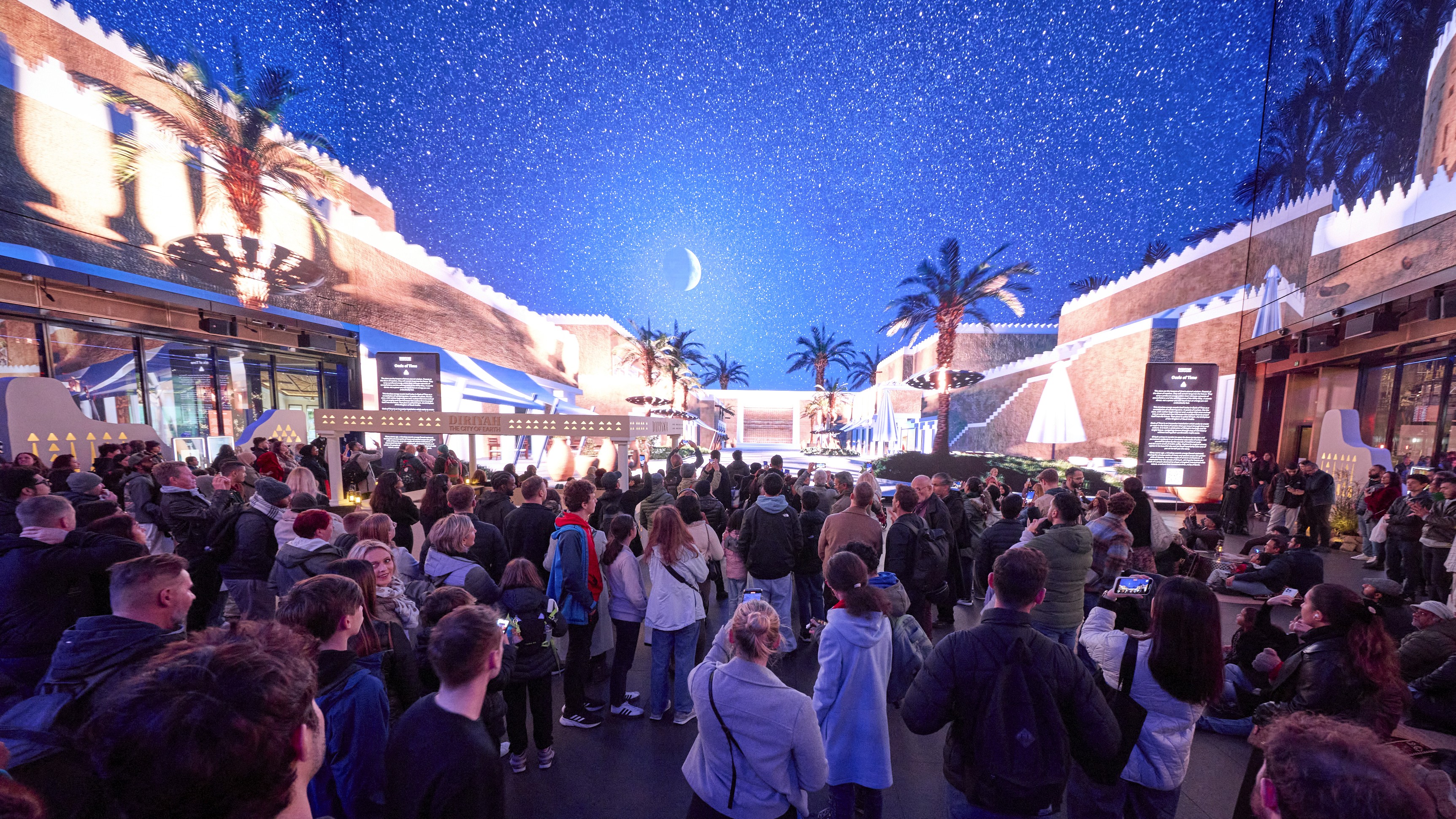 Now Arcade: A transitional sensory tunnel that used high-resolution Media to maintain the atmospheric golden hour of Diriyah as people moved through the venue.