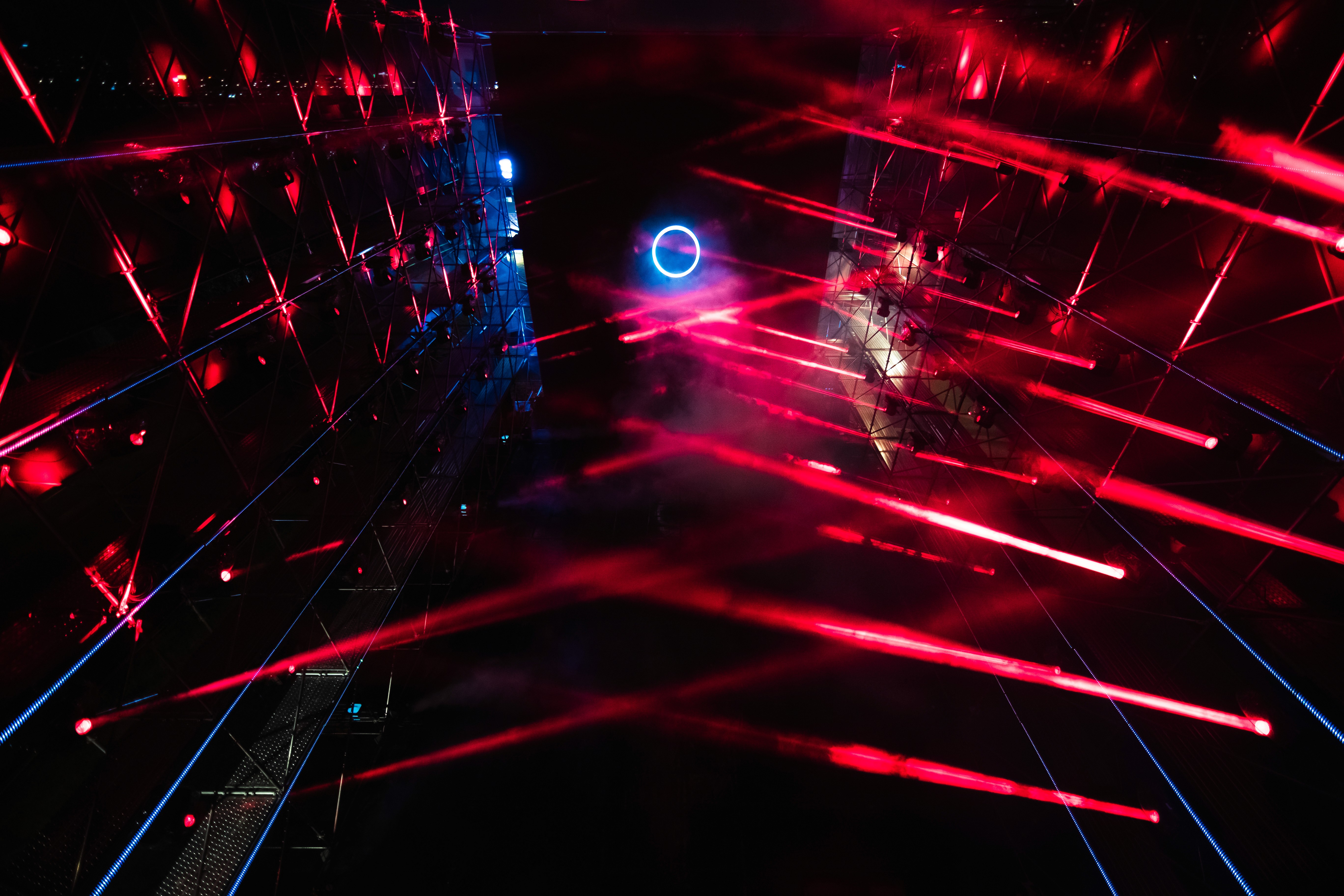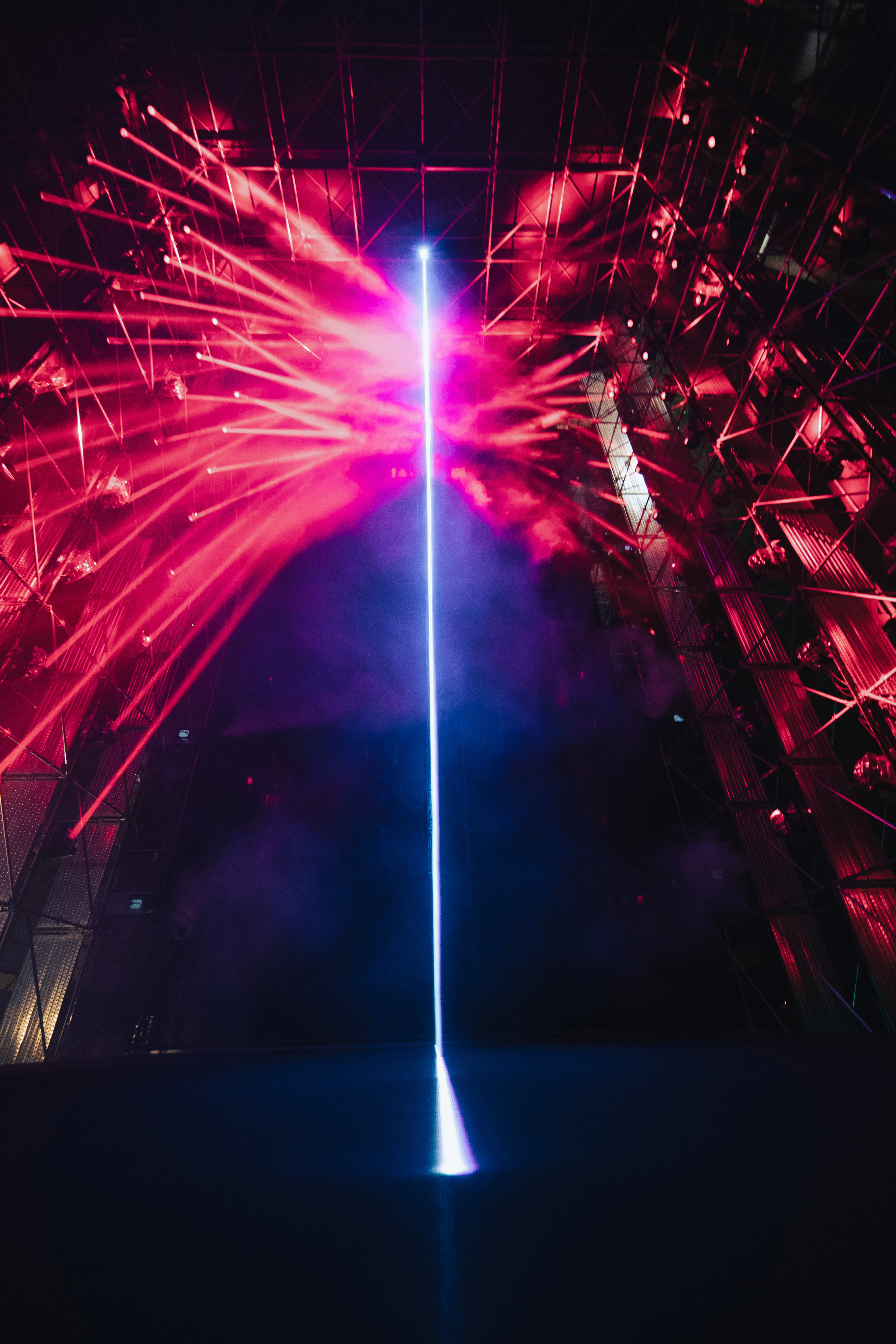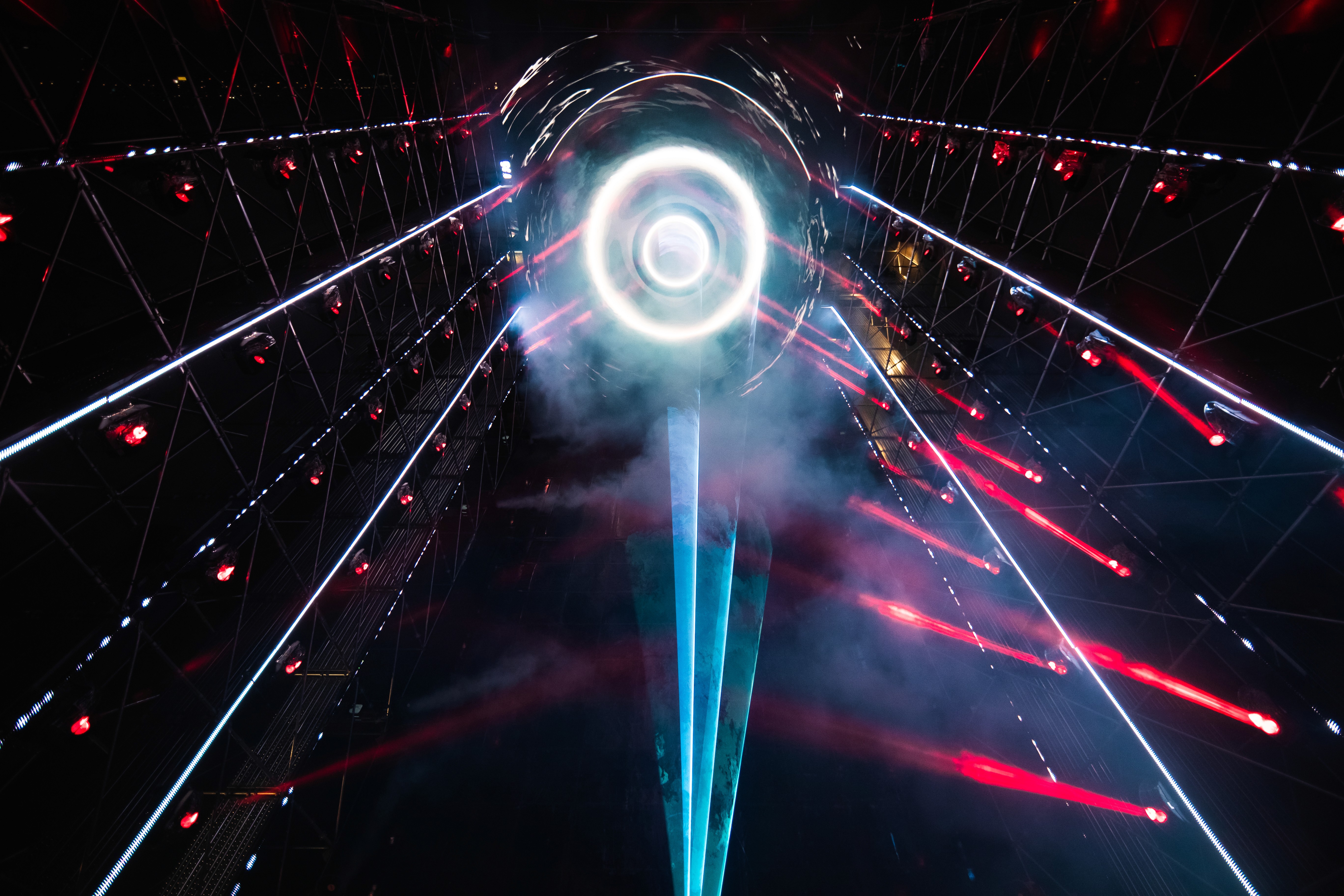 Our team used Unreal Engine 5 for real-time 3D simulation and previsualization, while TouchDesigner was used to coordinate complex light fixture movements and spatial orientation. We developed a bespoke 10-minute audio-visual piece with a specific intensity curve to guide people through the experience. To ensure flawless operation over the 15-day event, we constructed a custom GUI in TouchDesigner for automated media server control.