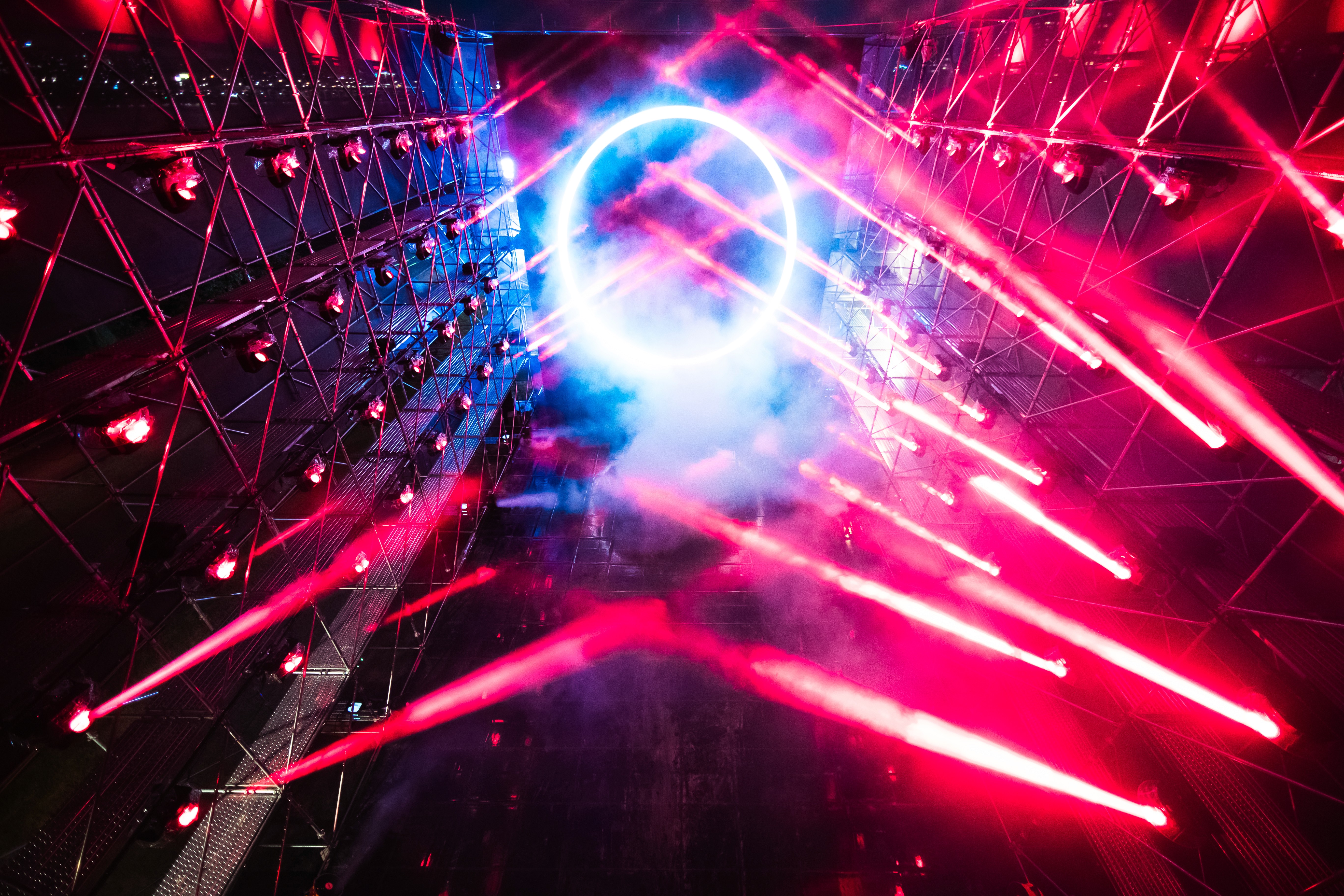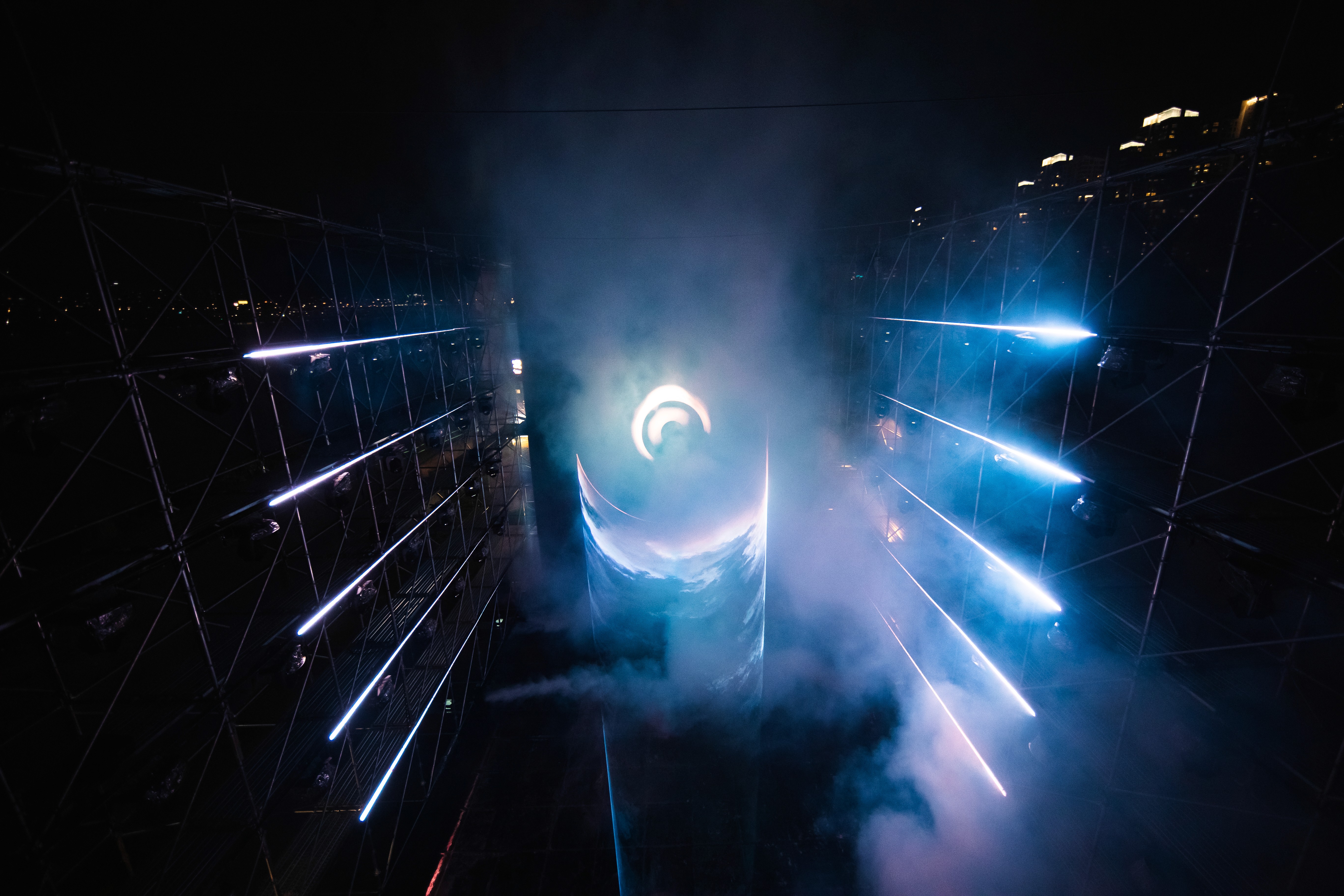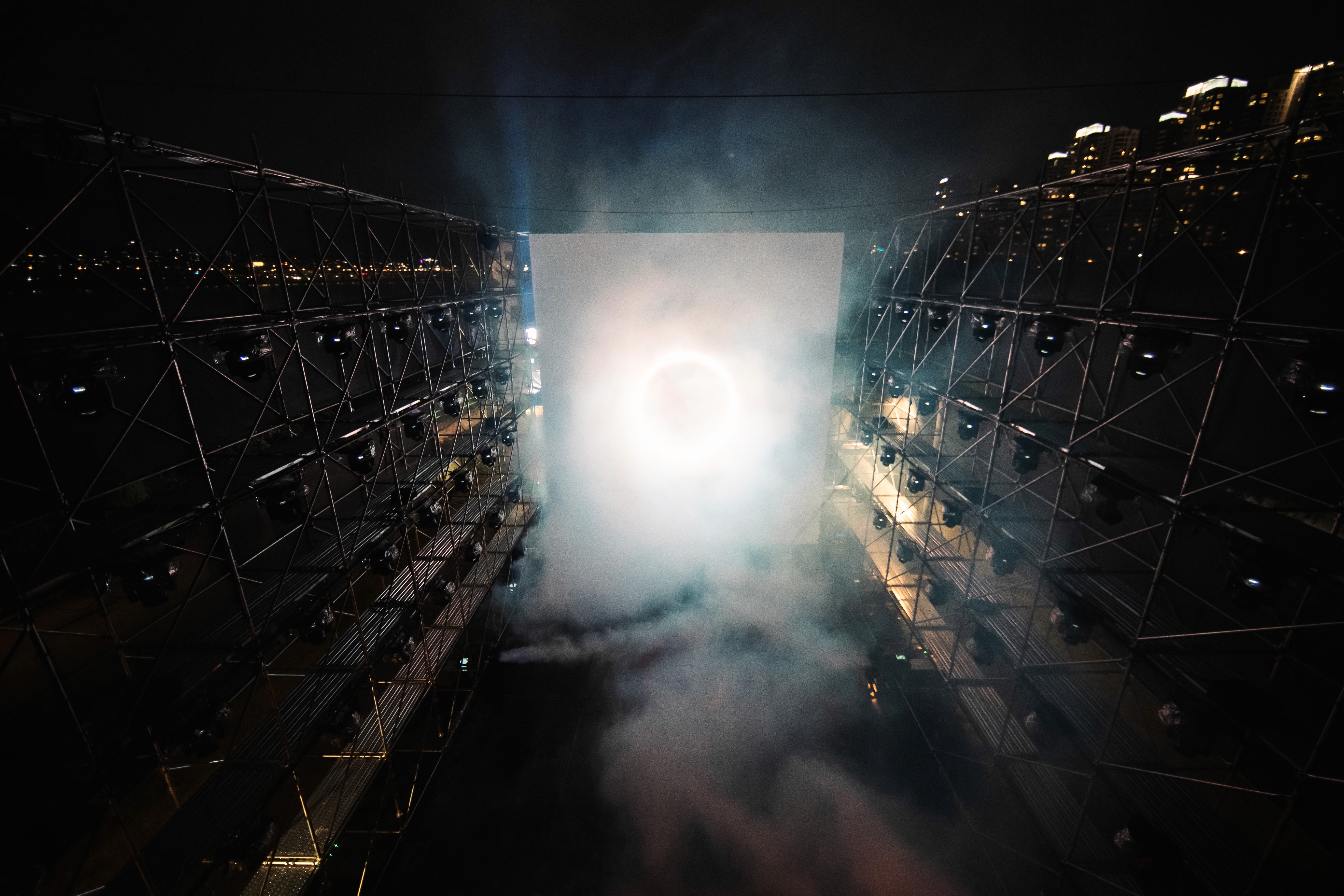 We designed and built a massive 26m x 16m x 12m structure at Han River Park, covered in shark tooth fabrics and integrated with a high-fidelity multimedia system. The installation featured a 10m x 12m LED screen, 60 moving heads, 200 metres of batten LED, and 16 high-intensity lasers.