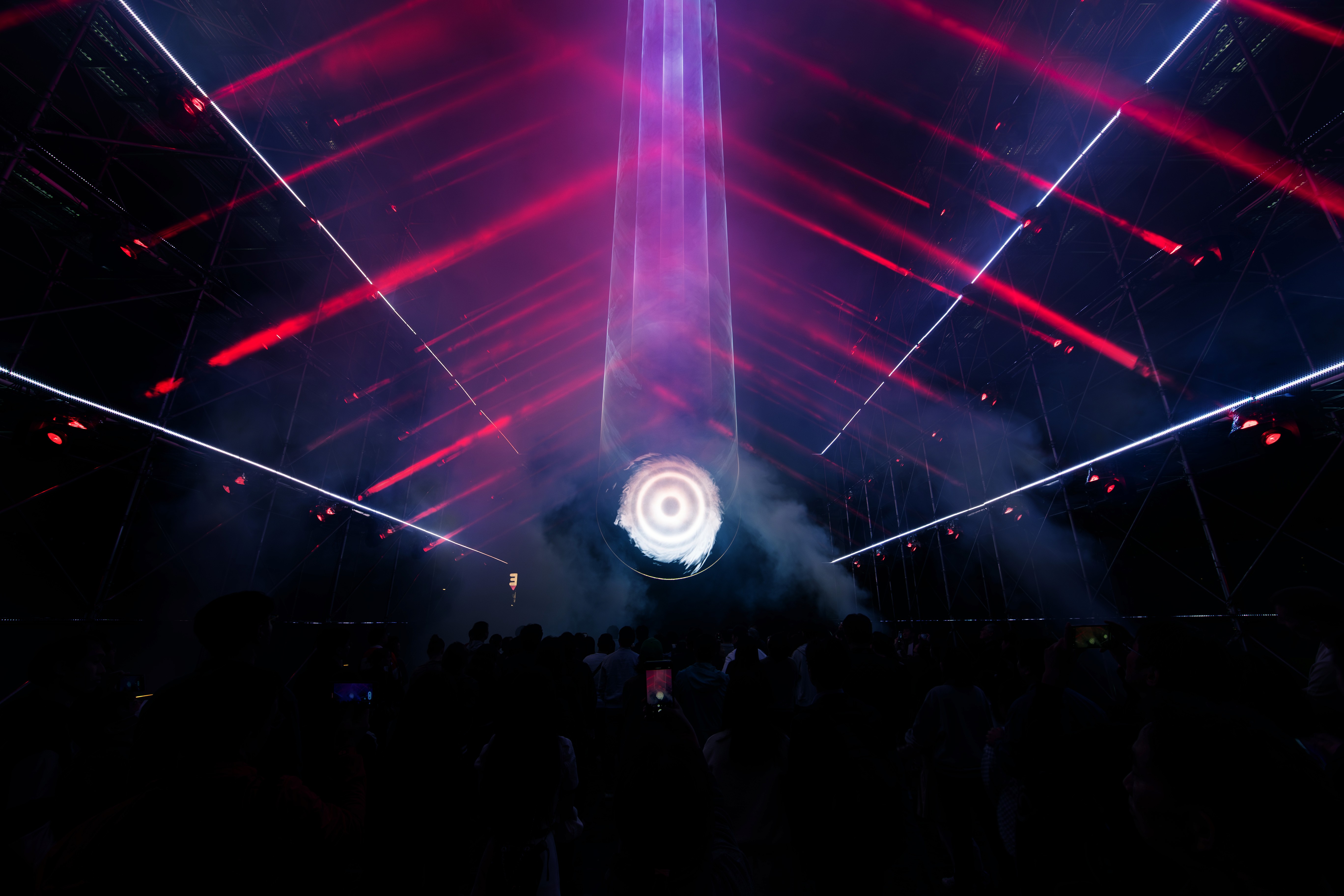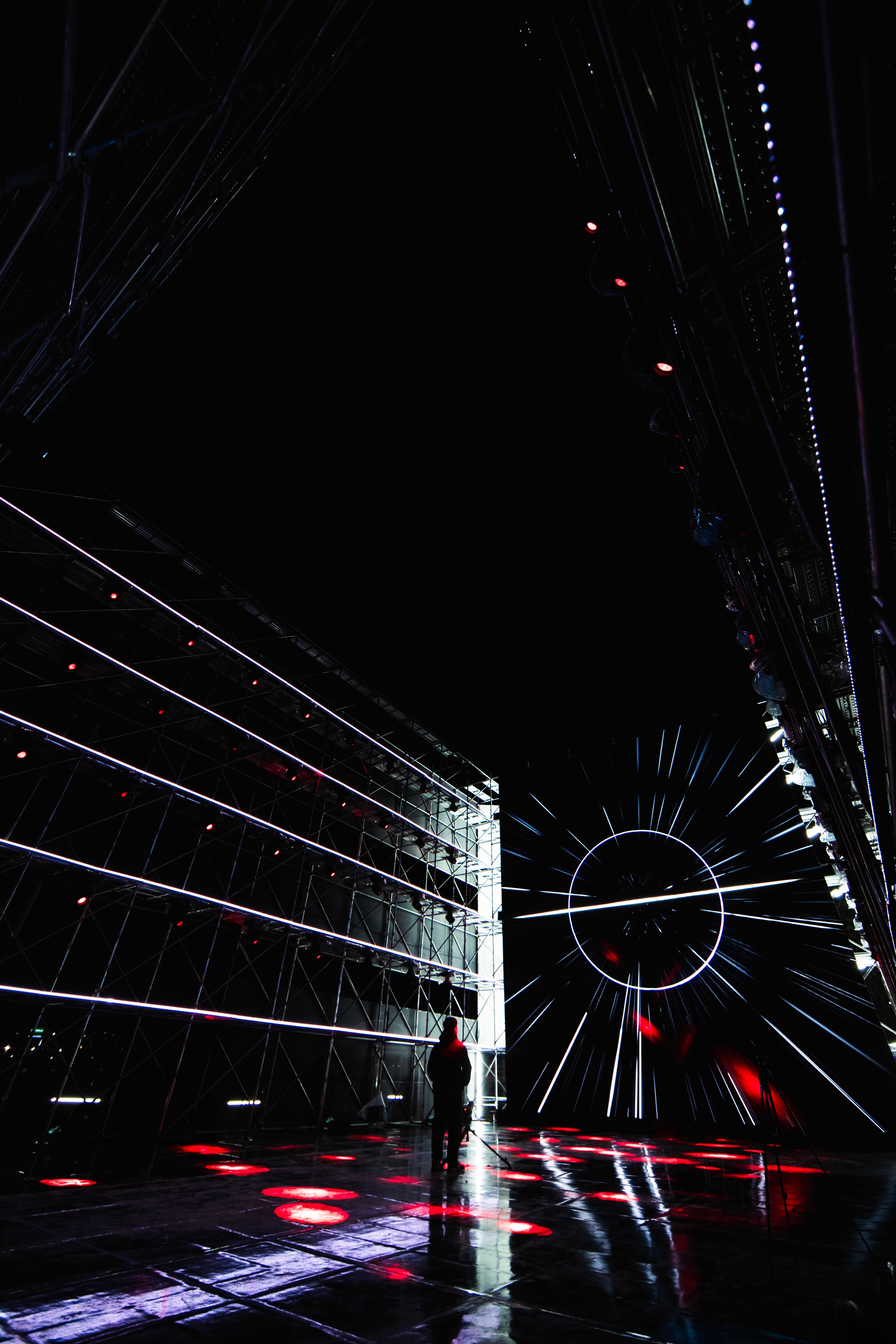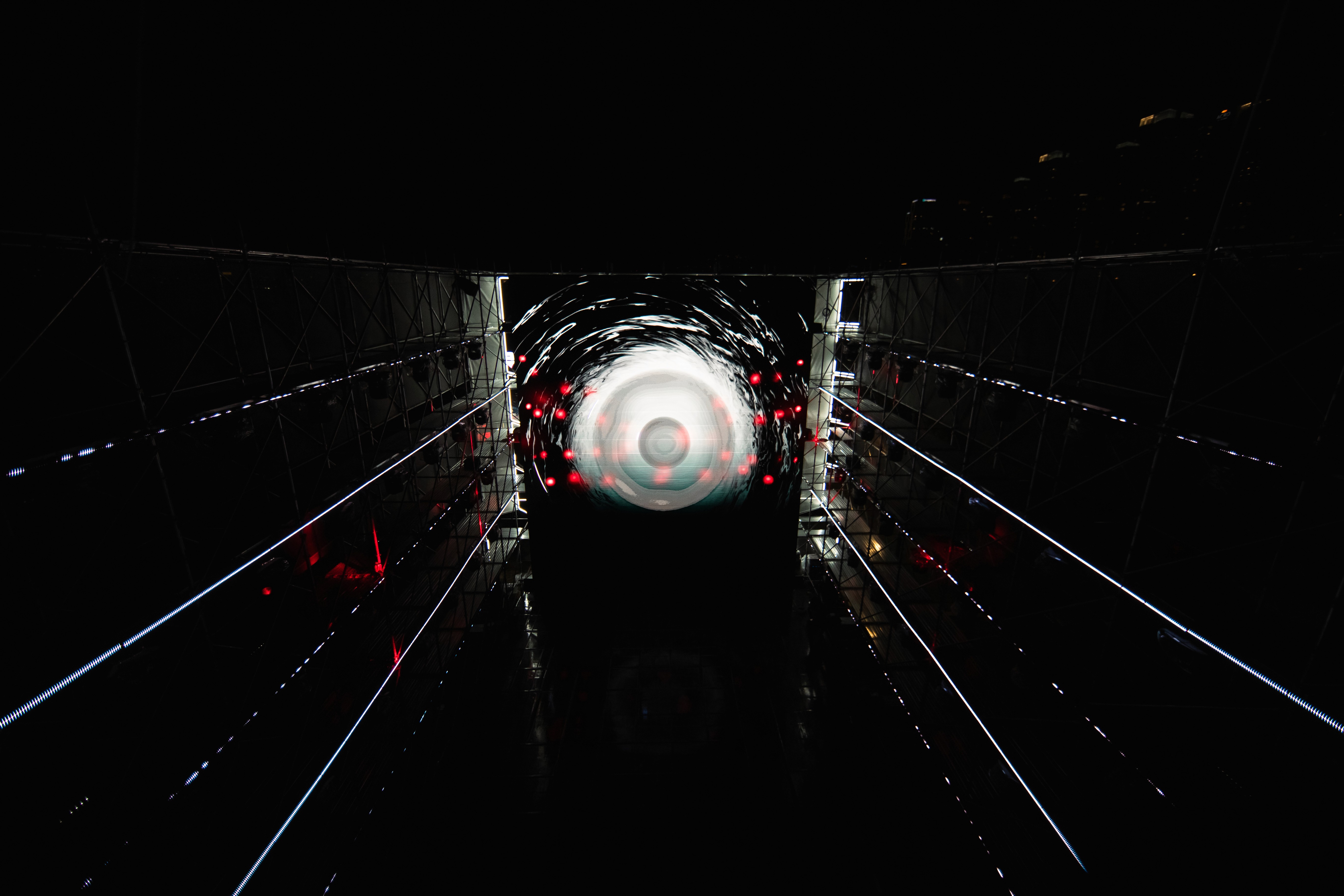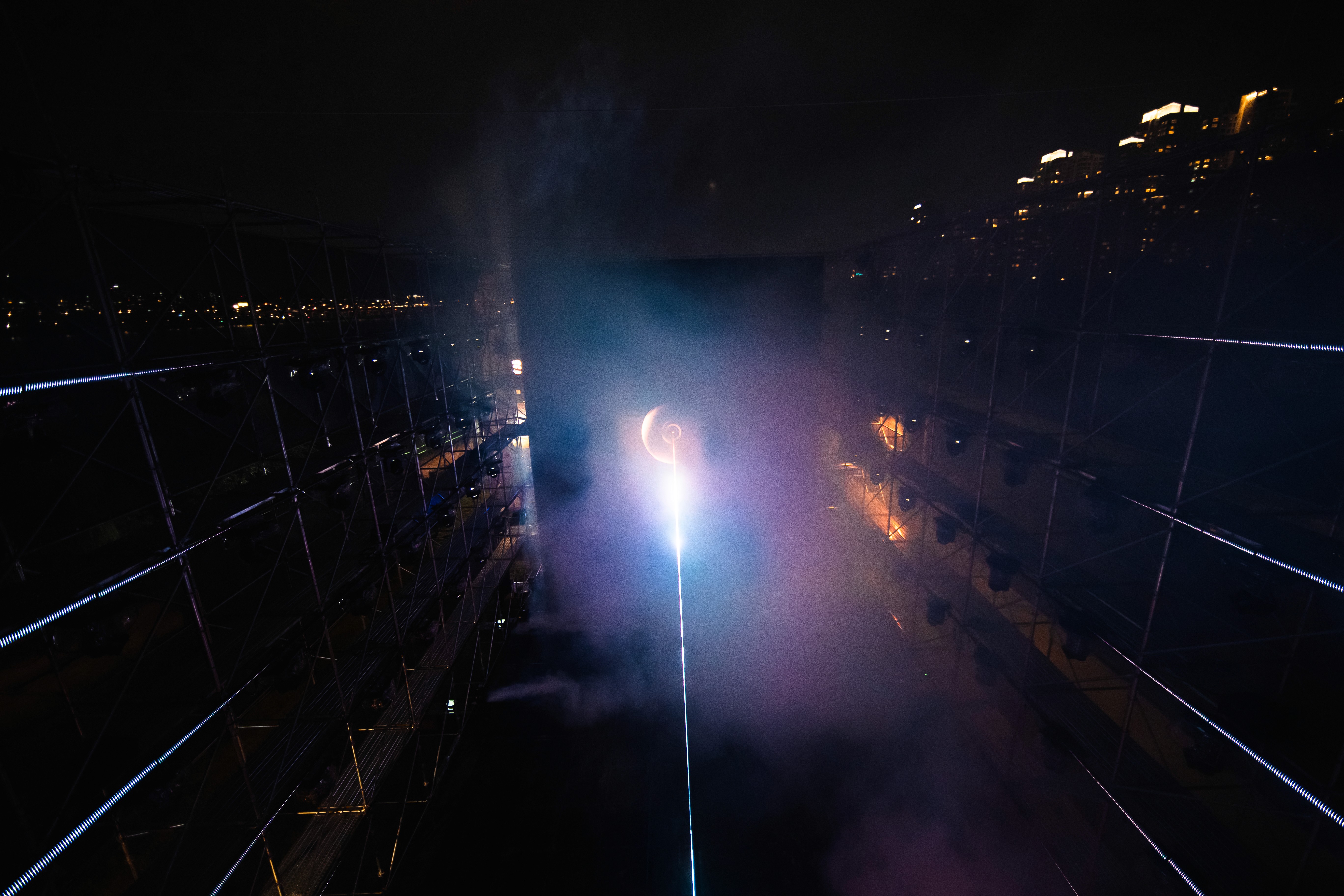 We designed and built a massive 26m x 16m x 12m structure at Han River Park, covered in shark tooth fabrics and integrated with a high-fidelity multimedia system. The installation featured a 10m x 12m LED screen, 60 moving heads, 200 metres of batten LED, and 16 high-intensity lasers.